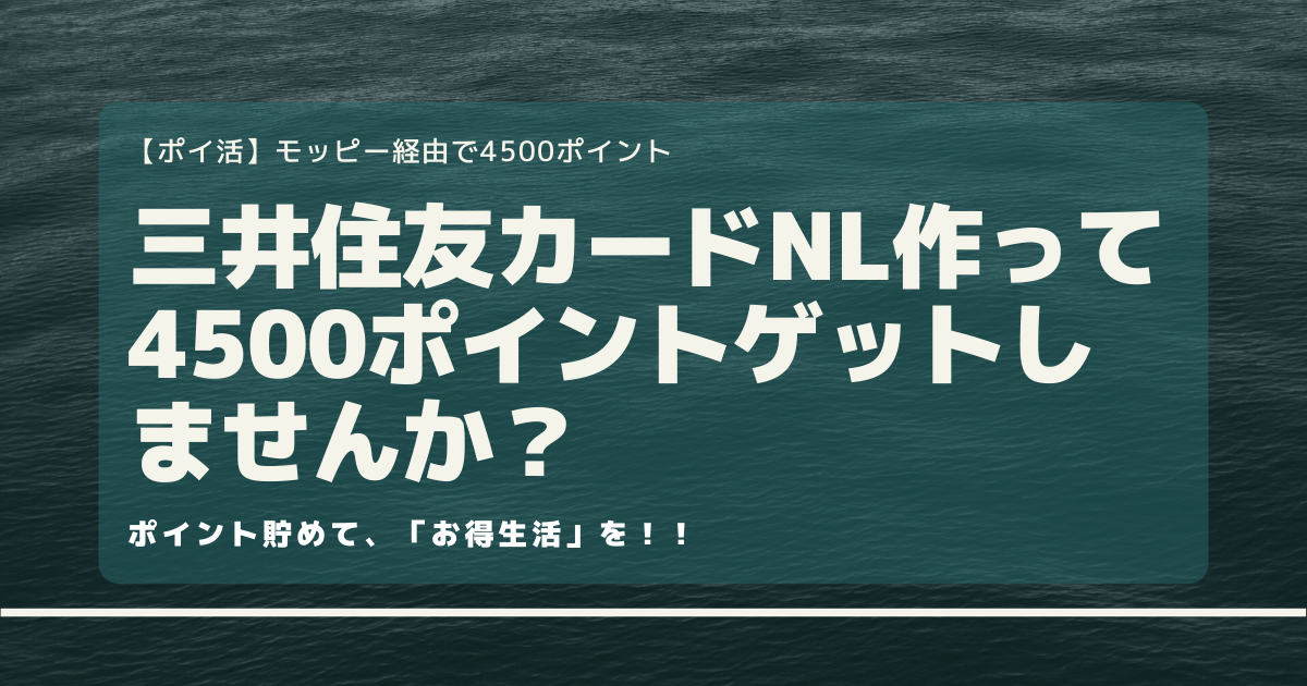先日、モッピー経由で三井住友カード(NL)を作って、10500ポイントをゲットしました。現在、モッピーでは、4,500ポイントの案件となっております。